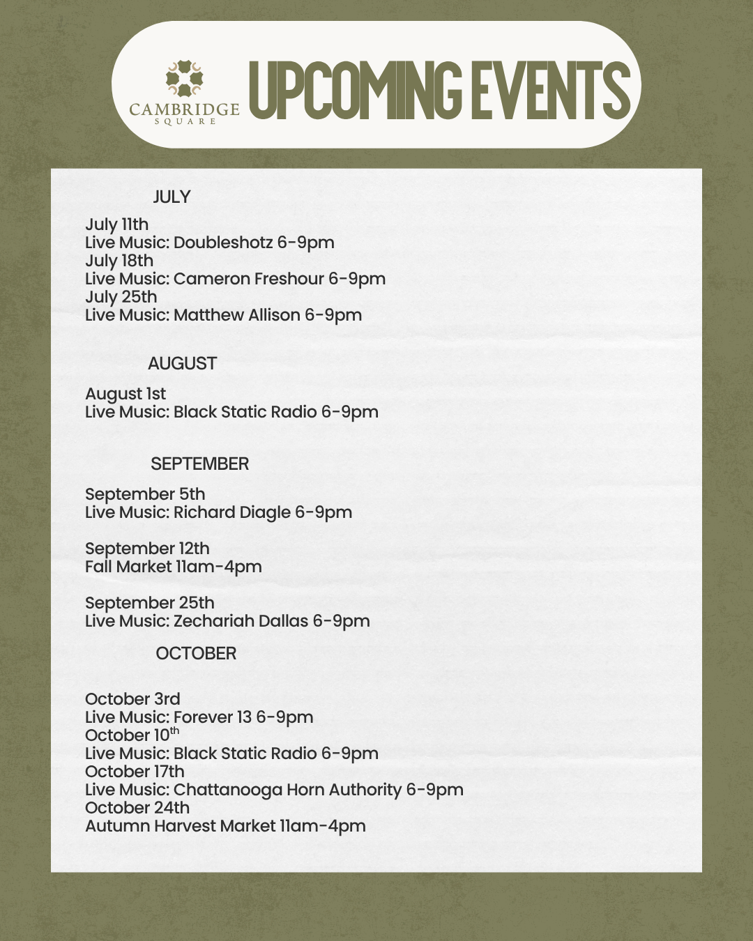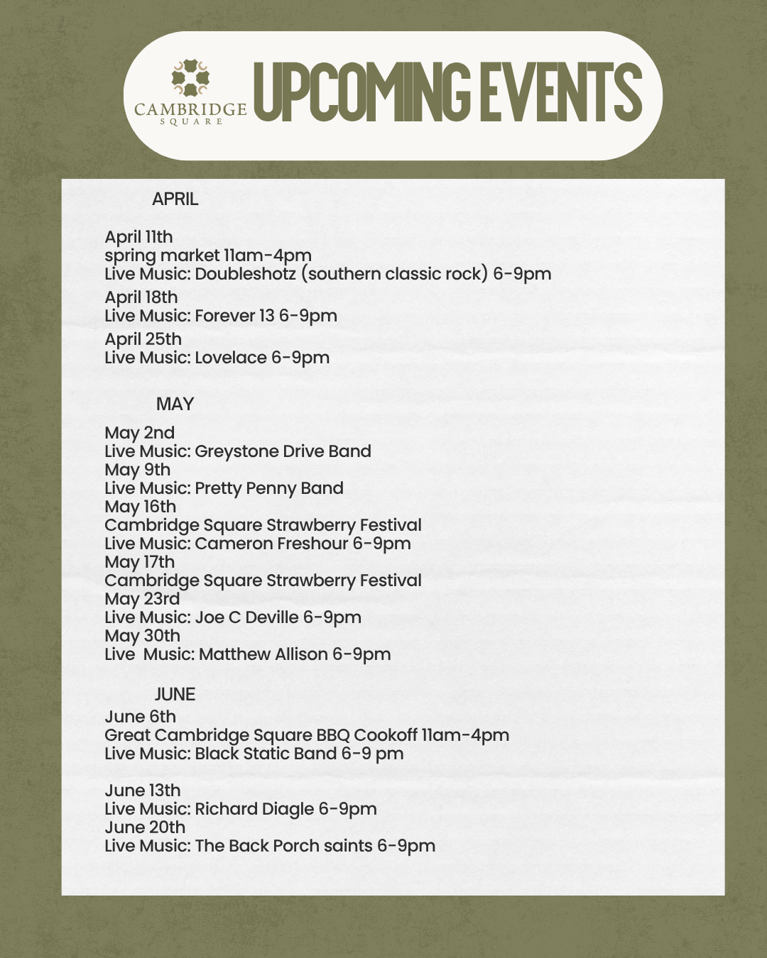 Experience the best of Cambridge Square through live music, pop-up markets, and community events designed to bring people together. Scroll down to view our upcoming events April through October.